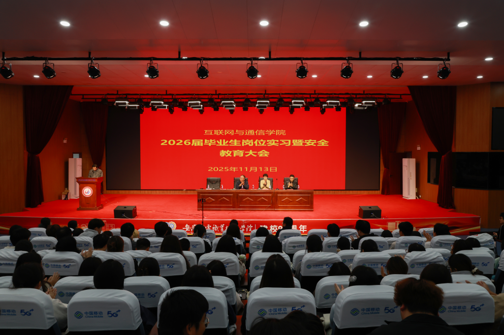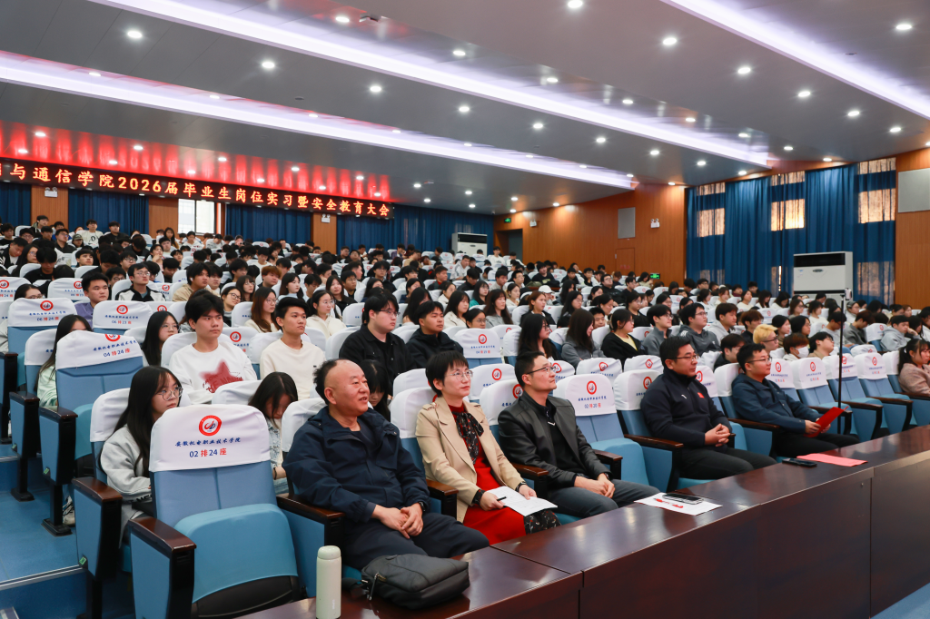 为扎实推进学生顶岗实习工作,引导学生明确实习目标与任务,确保实习活动安全、有序、高效进行,11月13日下午,互联网与通信学院在文津礼堂隆重举行了2026届毕业生岗位实习暨安全教育大会,学院党政班子全体成员、各教研室主任、毕业班辅导员以及即将奔赴实习岗位的2026届全体毕业生参加了此次大会,会议由学院副院长潘涛主持。