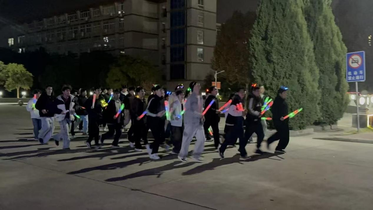 活动一开始,同学们就在学校指定集合点迅速聚集。随着一声指令,手持荧光棒的队伍有序出发,沿着校园的道路开启了这场夜跑。夜色里,路灯把沿途的路径晕染得暖意融融,大家步伐轻快,还时不时和身边的同伴笑着打气。整个队伍始终整齐又热闹,成了校园夜里一道亮眼又温馨的风景线。