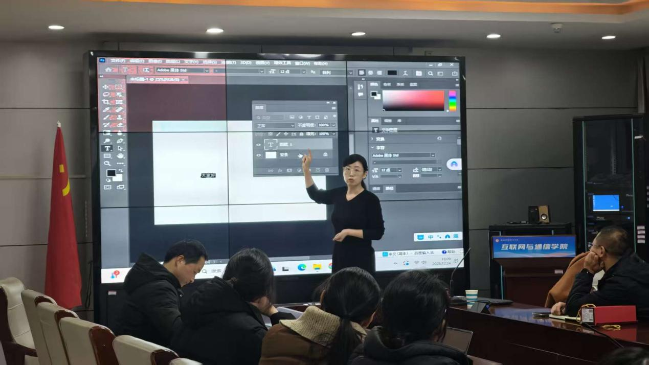 授课中,樊匀教授以“实操+互动”为核心设计教学流程,精准契合高职教育实操型人才培养目标。课堂开篇,她借助Photoshop软件,由浅入深、步骤清晰地演示文字工具栏的使用方法,通过通俗解读帮助青年教师快速厘清操作逻辑;随后创新性引入“皖南皮影”这一经典传统文化案例,润物无声地展示出课程思政内容,将专业技能与传统文化巧妙融合,让枯燥的软件操作课堂更具温度与内涵。其幽默风趣的教学风格与干货满满的内容输出,赢得现场阵阵热烈掌声。
