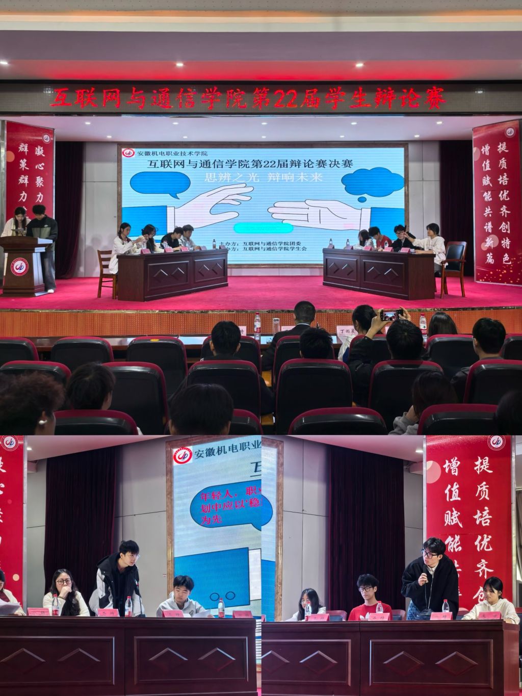 为提升学生思辨能力和创造能力,激发自主思考能力,营造浓厚的思辨氛围,落实学院“立德树人·同心护安”行动,织牢“全员育心”守护网。互联网与通信学院4月1日至15日组织了辩论赛预赛与复赛,并于4月16日中午在明德楼报告厅举办以“年轻人职业规划中应以稳定或者热爱为先”为主题的辩论赛决赛。互联网与通信学院党总支副书记王东华、分团委副书记丁雨晨、辅导员祖蕾,王文琦担任决赛评委。百余名学子到场观赛,共同开启一场关于青春与未来的思想对话。