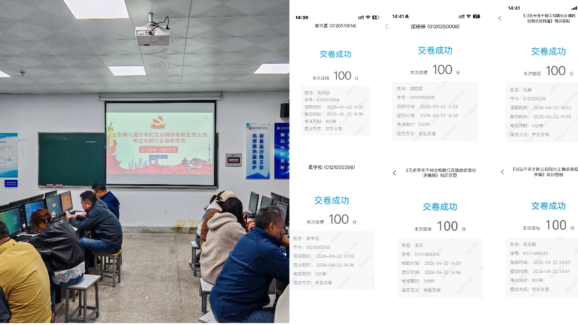 为深化树立和践行正确政绩观学习教育,筑牢教师思想根基,4月22日下午,互联网与通信学院实训网络教研室党支部在2114实验室开展了专题知识答题活动,由党支部书记石王阳主持,教研室全体教师参与。