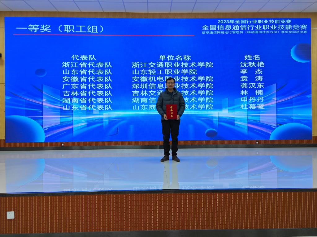 11月29日,2023年全国信息通信行业职业技能竞赛信息通信网络运行管理员赛项全国总决赛在山东轻工职业学院圆满落幕。经过激烈的角逐,安徽机电职业技术学院互联网与通信学院教师袁涛荣获职工组全国一等奖。
